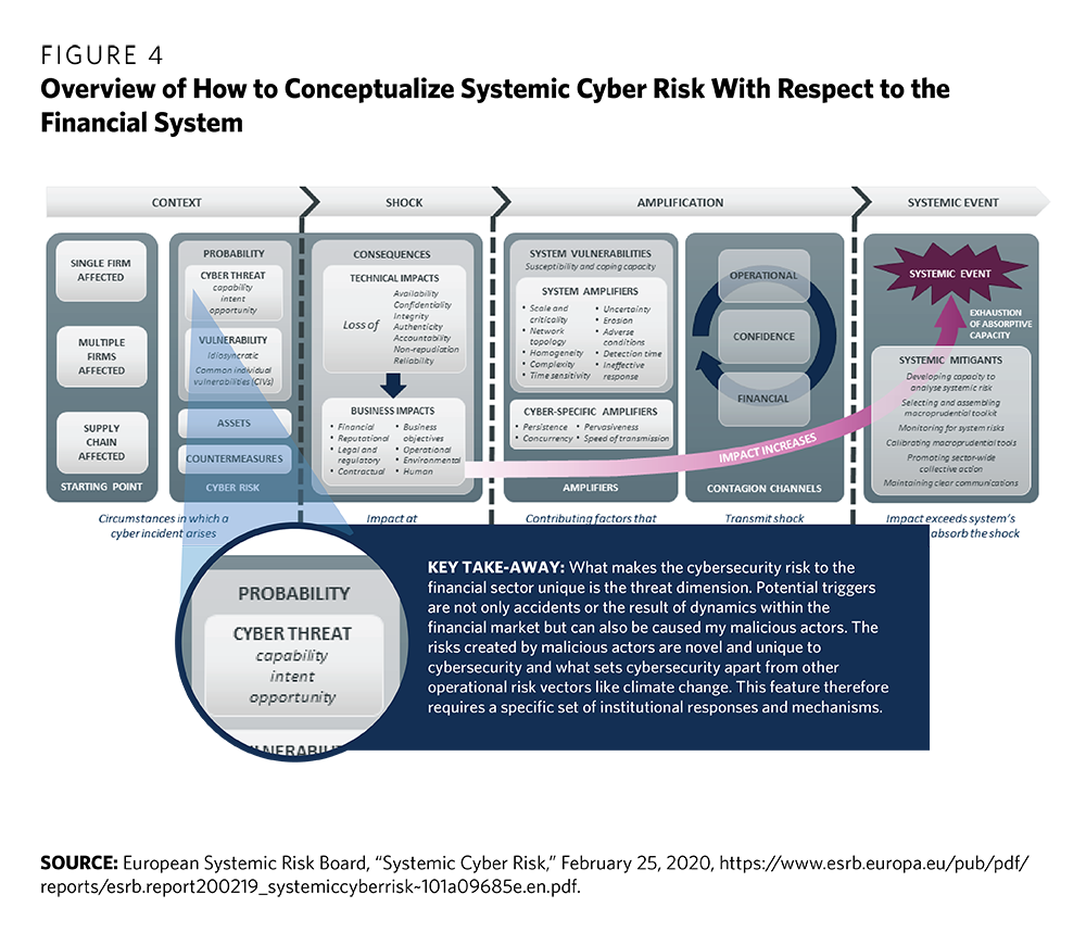7 Tim Maurer et al., “Toward a Global Norm Against Manipulating the Integrity of Financial Data,” Carnegie Endowment for International Peace, March 2017, https://carnegieendowment.org/2017/03/27/toward-global-norm-against-manipulating-integrity-of-financial-data-pub-68403; European Systemic Risk Board, “Systemic Cyber Risk,” February 25, 2020, https://www.esrb.europa.eu/pub/pdf/reports/esrb.report200219_systemiccyberrisk~101a09685e.en.pdf; Greg Ros, “The Making of a Cyber Crash: A Conceptual Model for Systemic Risk in the Financial Sector,” European Systemic Risk Board, Occasional Paper Series No 16, May 2020, https://www.esrb.europa.eu/pub/pdf/occasional/esrb.op16~f80ad1d83a.en.pdf.