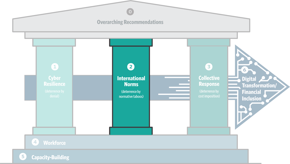 The following recommendations are designed to address the uncertainty regarding how international law applies to cyberspace and malicious cyber activity targeting financial institutions, and to build and reinforce existing efforts to advance international norms.