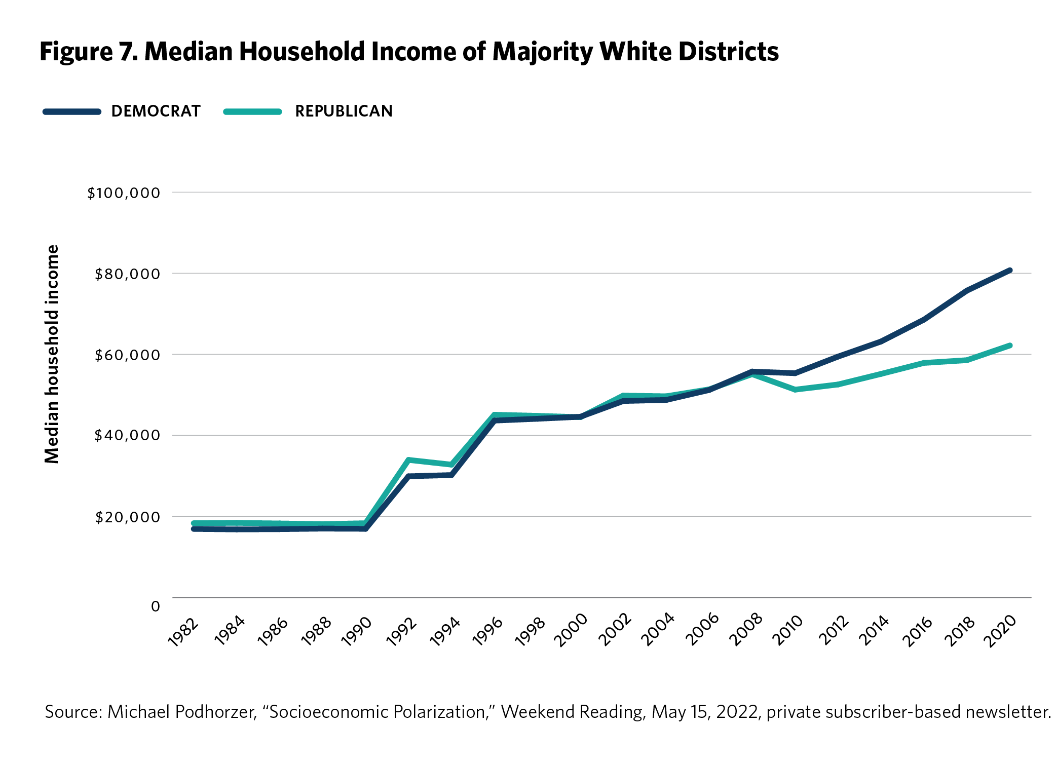It is a common assumption that people who hold views from both sides of the aisle are economically conservative and socially liberal—the profile of many in the upper-middle-class political elite trying to reduce polarization. In fact, a 2016 study showed that this type of moderate ideology was held by only 3.8 percent of the electorate. Instead, the preponderance of Americans who respond to ideological survey questions with answers on both sides of the aisle (28.9 percent of the electorate) tend to be pro–economic redistribution while also upholding the belief that American citizens should be White, Christian, and born in the United States.44 That mix of views led this group to be swing voters for many years, although since 2016 many have moved more decisively into the Republican Party.