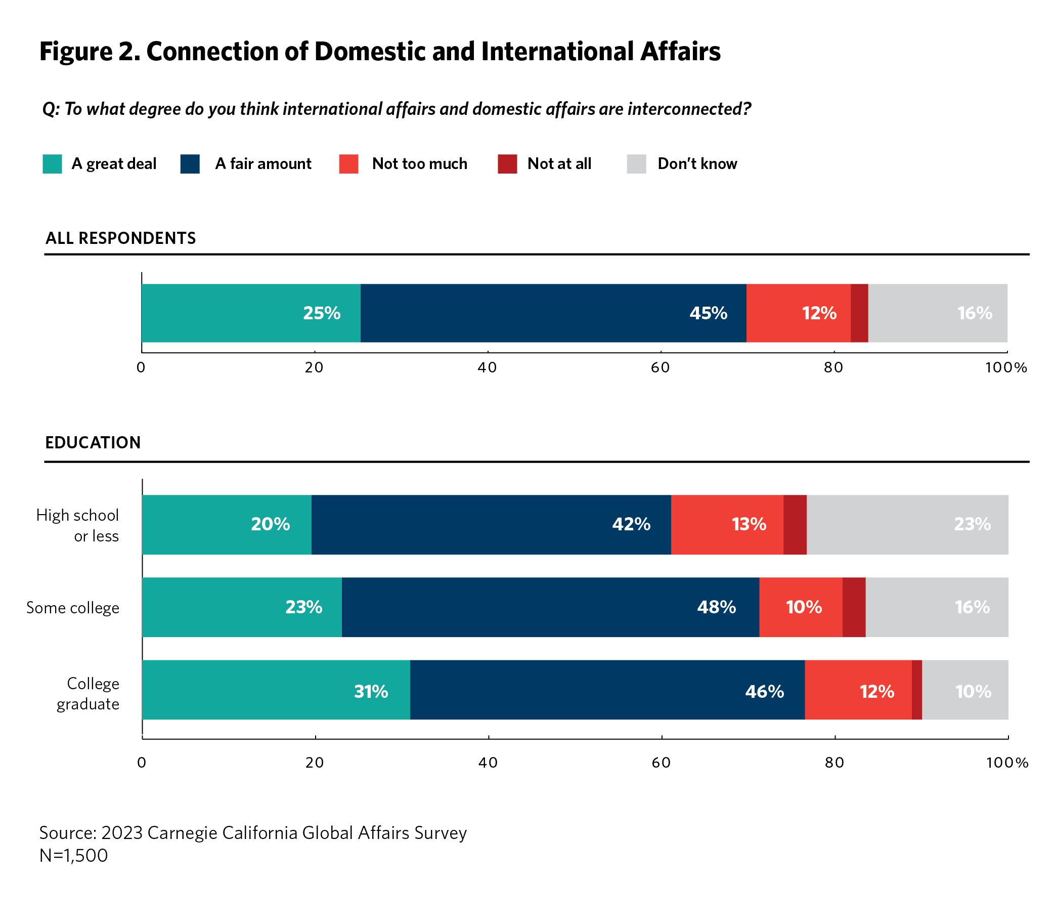 This is the first year of the Carnegie California Global Affairs Survey. Findings in this paper are based on a survey of 1,500 adult California residents. The survey was conducted via YouGov between July 20 and August 15, 2023, in English and Spanish according to respondents’ preferences. The questions in four topic areas were designed by the Carnegie California survey team. The Carnegie California survey team invited input, comments, and suggestions from policy experts and its own advisory group—including advisers from state and local government, California universities and think tanks, and civil society—during two workshops in early June 2023, but survey methods, questions, and content were solely determined by the Carnegie California survey team.