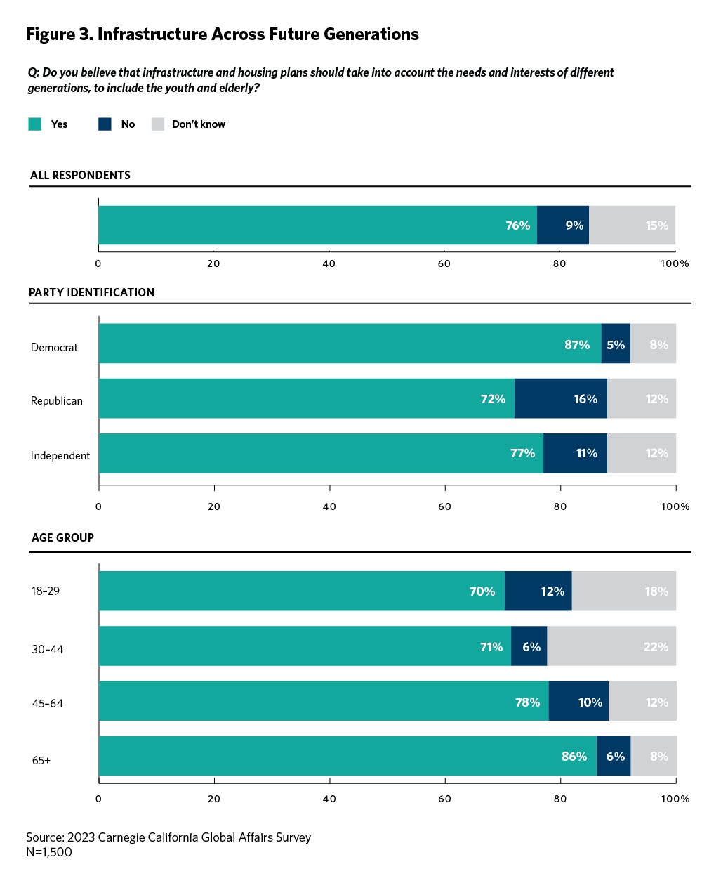 Solid majorities of Californians believe that considerations around emissions reductions and adaptation should include the needs and interests of different generations, including the youth and elderly (64 percent) and also the needs and interests of generations yet to come (66 percent). Moreover, solid majorities say that infrastructure and housing plans should take into account the needs and interests of different generations, including the youth and elderly (76 percent) and generations yet to come (66 percent). As illustrated in figure 3, majorities across demographic groups, regions of the state, and partisan groups hold these four beliefs.